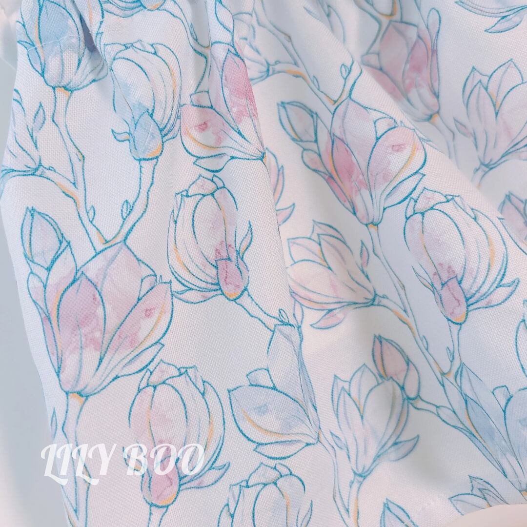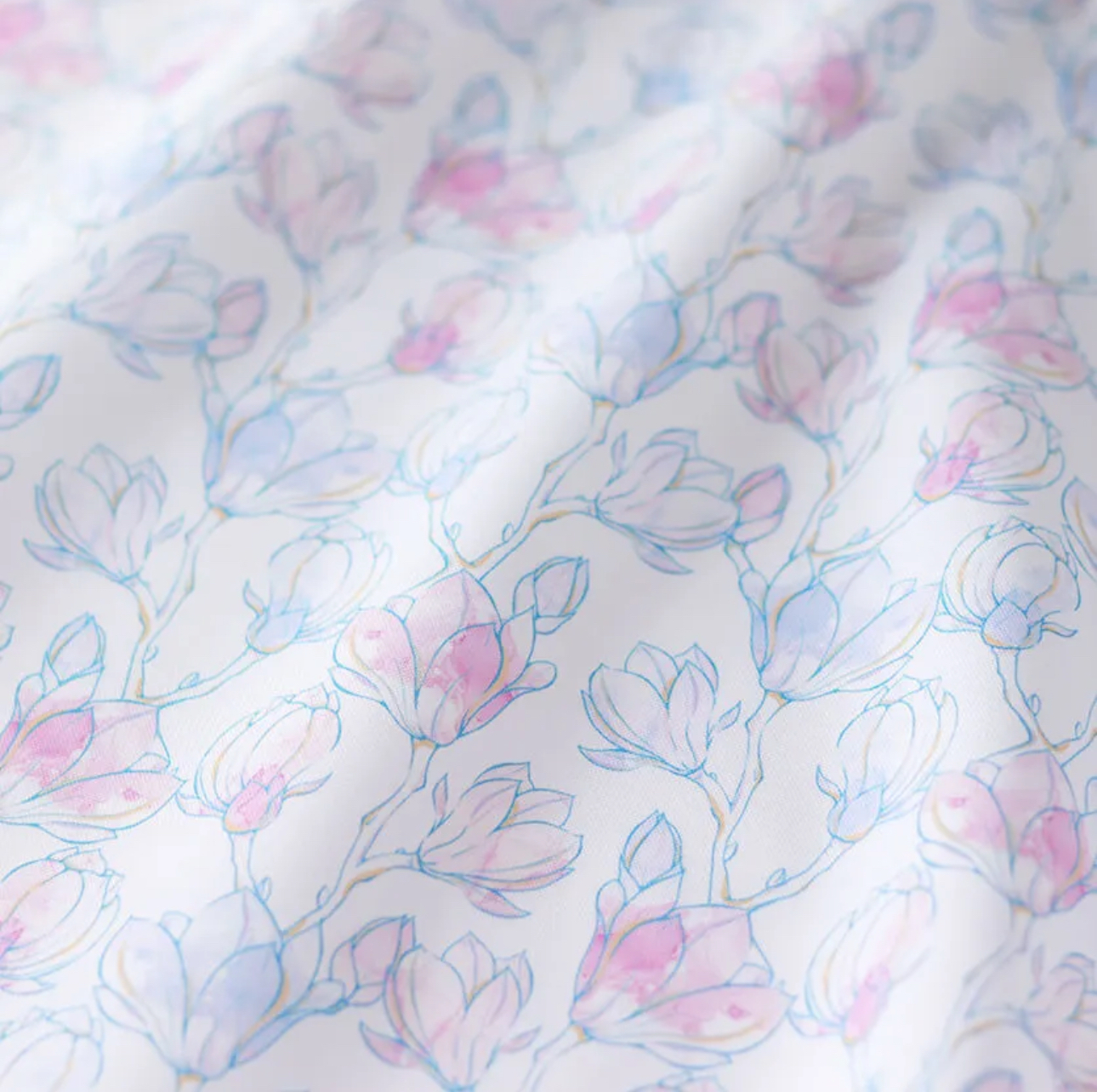 生地の柄はふっくらとしたやわらかな印象のモクレンの花を描いたテキスタイルデザイン。