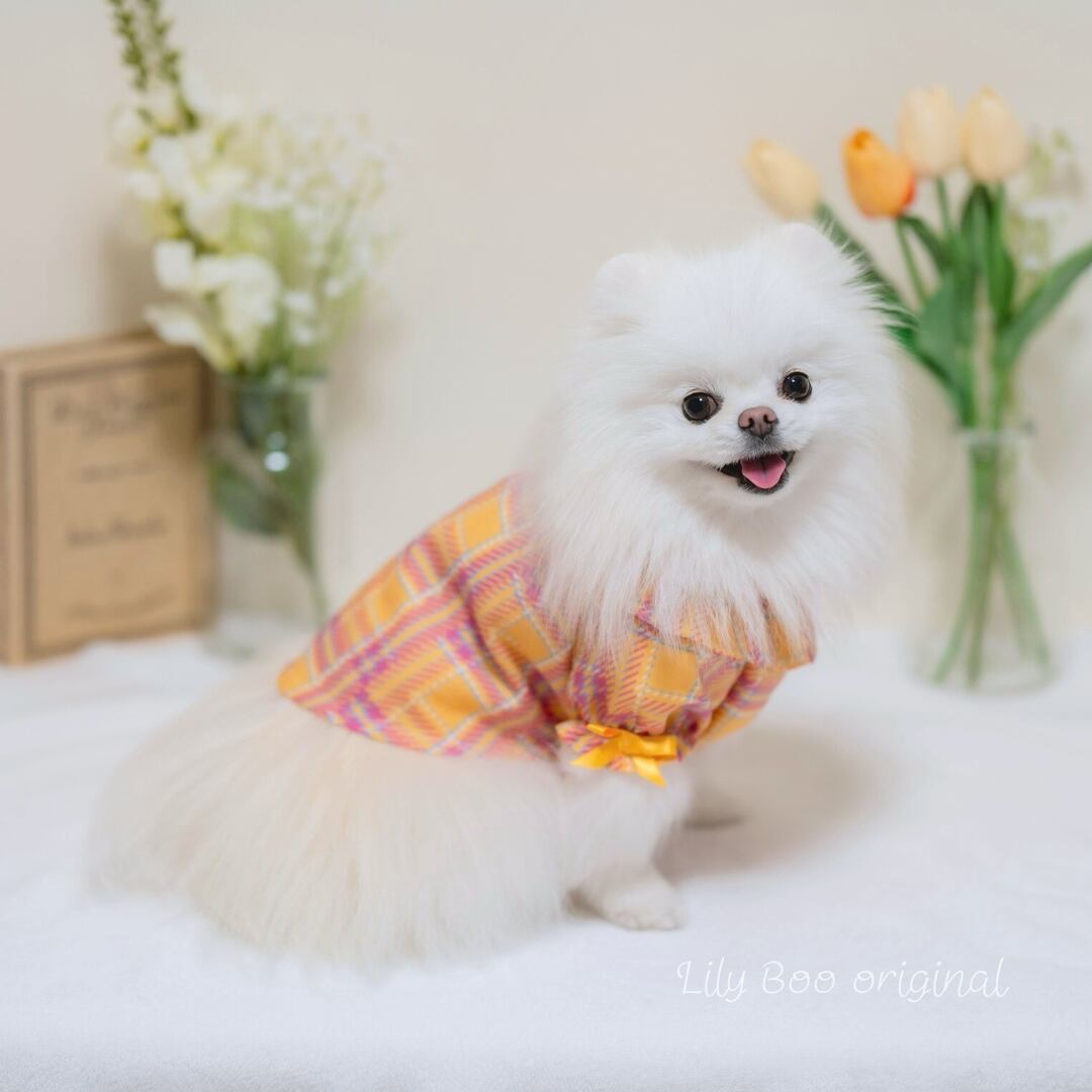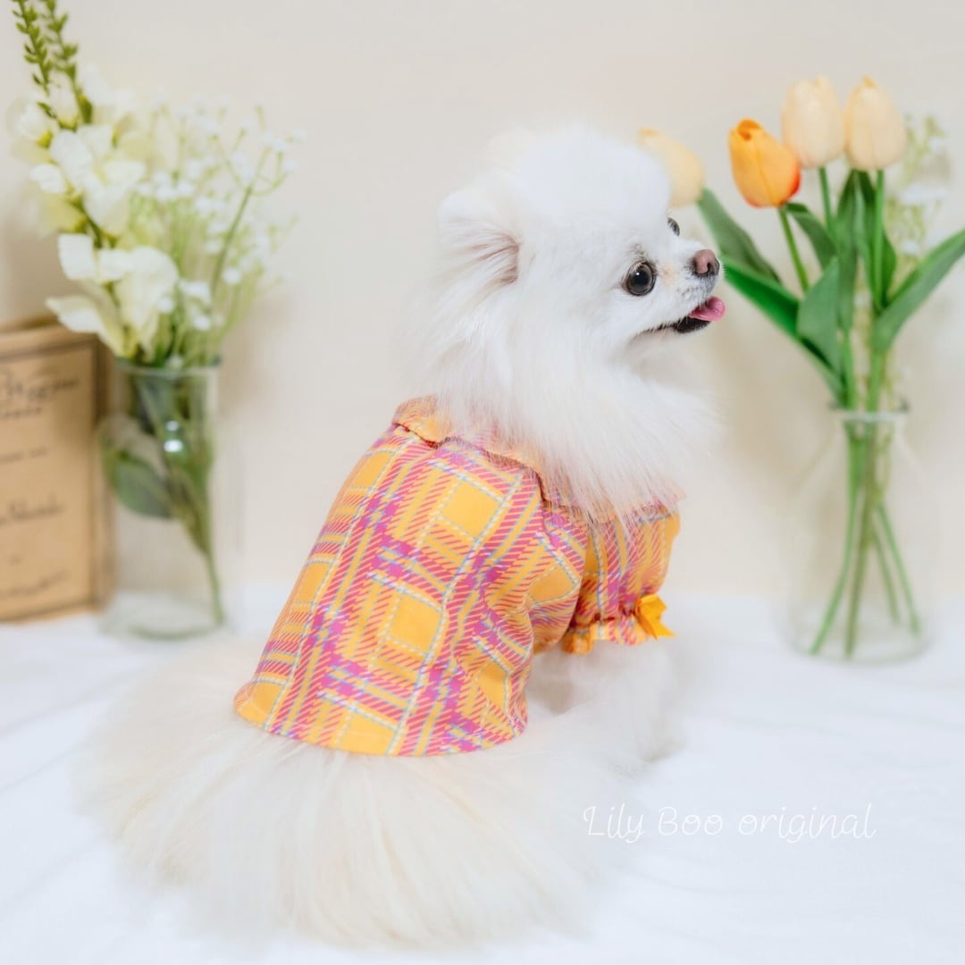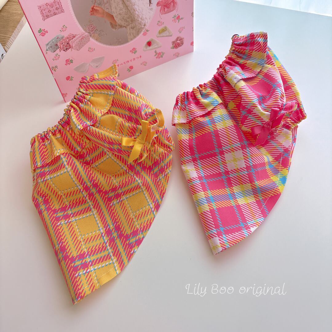スタンダードで飽きのこないタータンチェック柄。アクセントにサテンリボンを使ってお袖に付けました ♡♡ pink check と yellow check 2カラーから選べれます♡