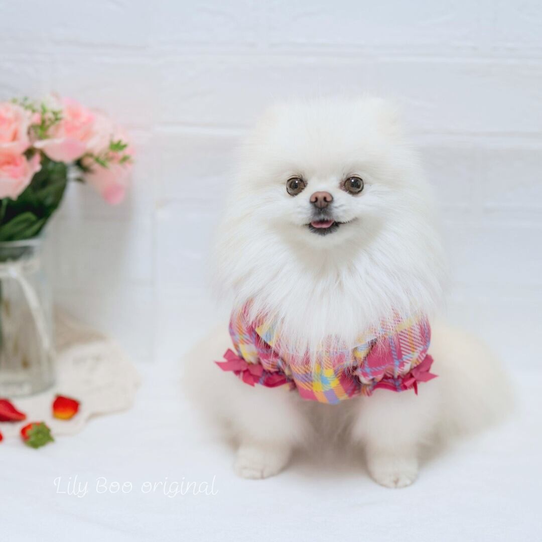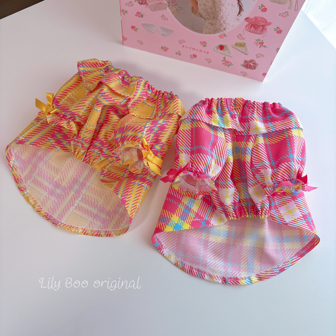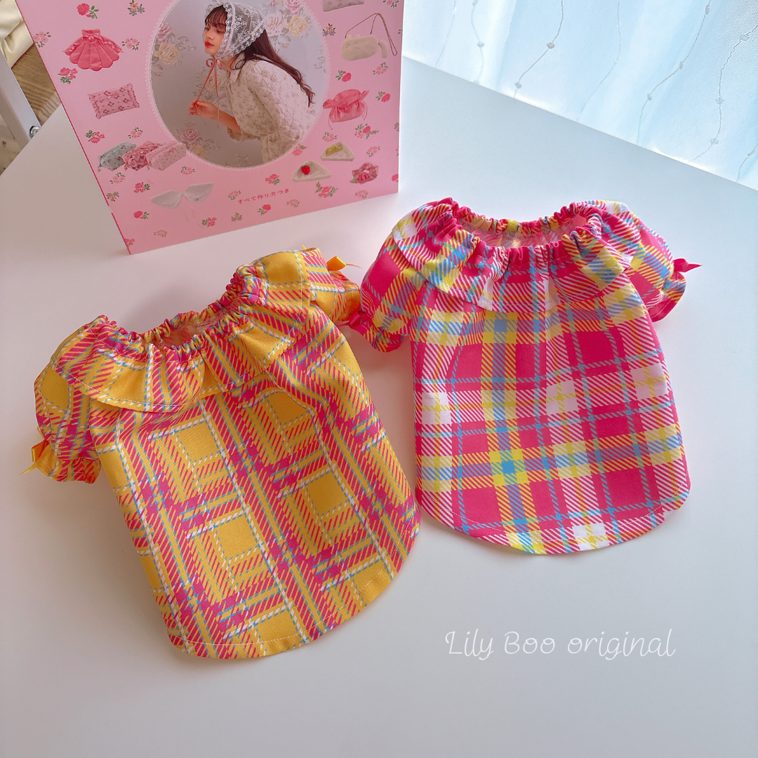 スタンダードで飽きのこないタータンチェック柄。アクセントにサテンリボンを使ってお袖に付けました ♡♡ pink check と yellow check 2カラーから選べれます♡