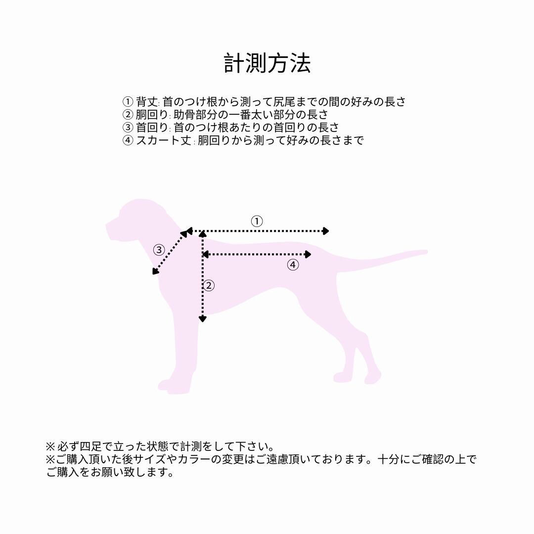 ワンちゃんの計測の際、必ず四足で立った状態で計測をして下さい。商品詳細ページ記載のサイズやおすすめのサイズの選び方をご確認頂いた上でのご購入をお願い致します。